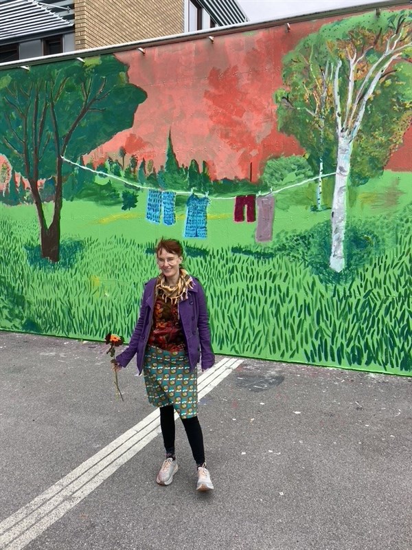 2024 september. Gjorde väggmålningen ”Jag hängde dina kläder” intill Konstjord, Gottsunda centrum, Uppsala